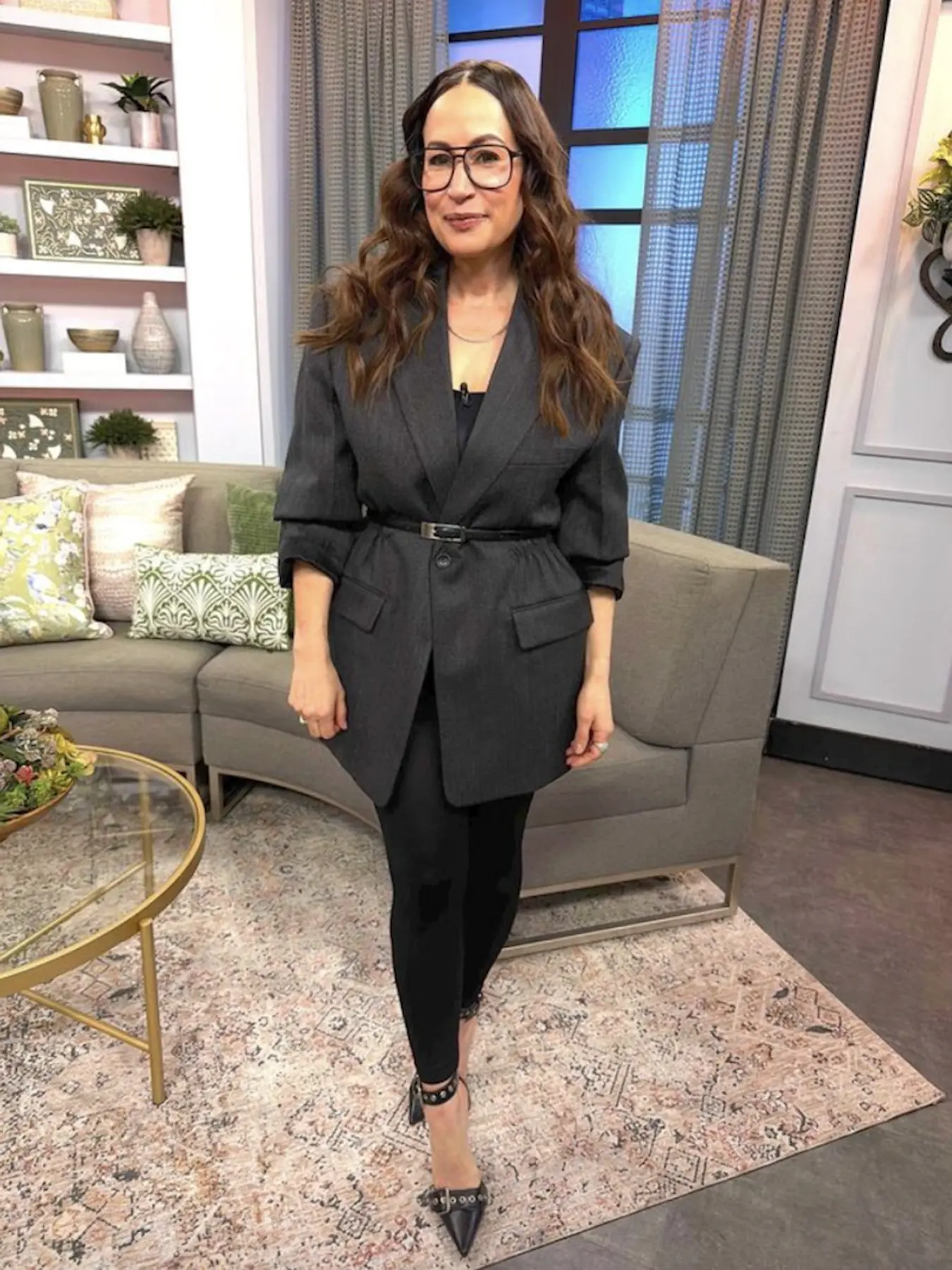 Self: 55% nylon, 40% rayon, 5% spandex Lining: 100% polyester Made in China Dry clean only Single breasted closure 3-pocket design Buttoned cuffs Suiting fabric with padded shoulders Note item does not include belt