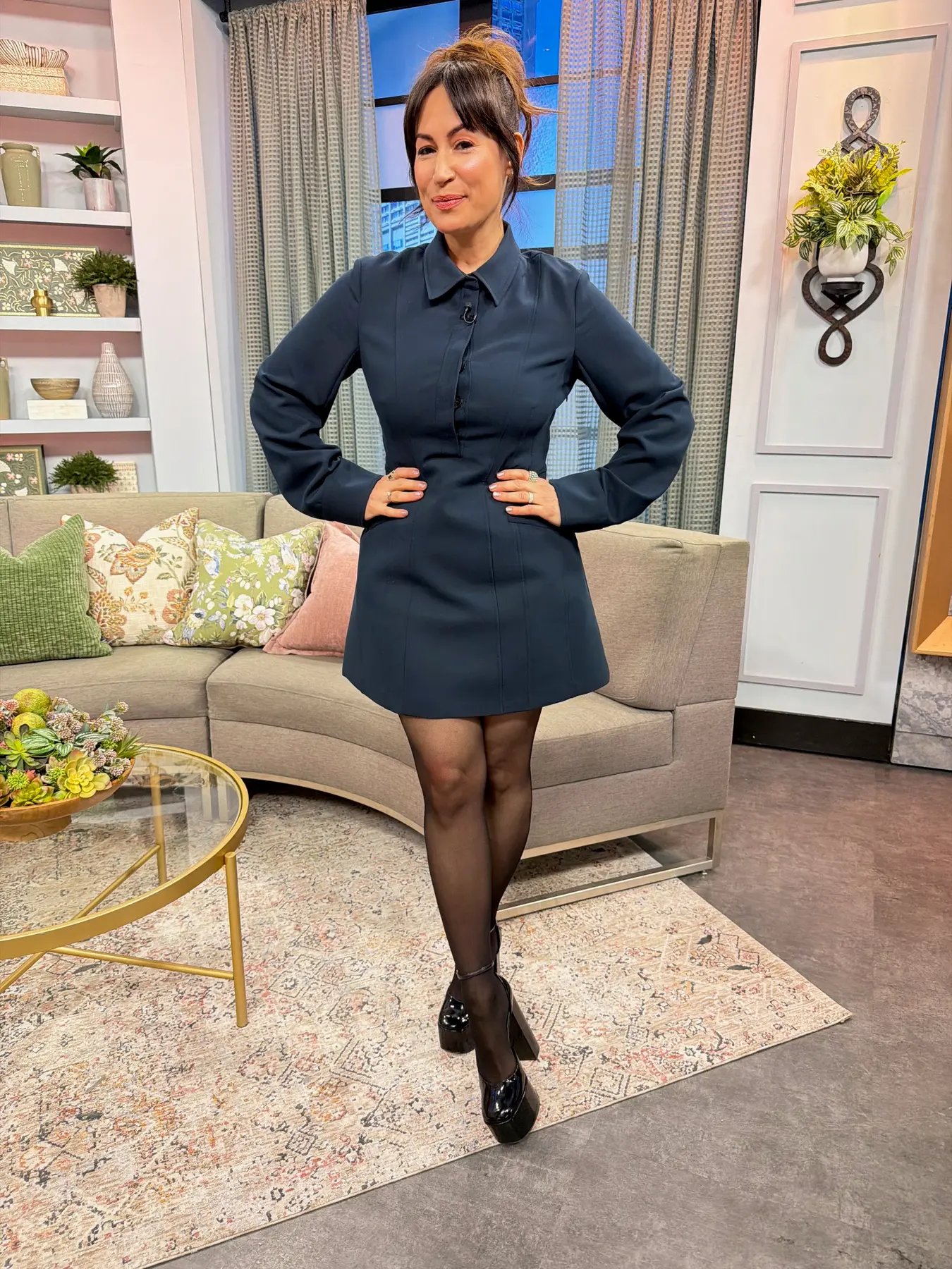 Short dress with lapel collar and long cuffed sleeves. Welt pockets on the front. Flared hem. Front closure with buttons hidden by a placket.
