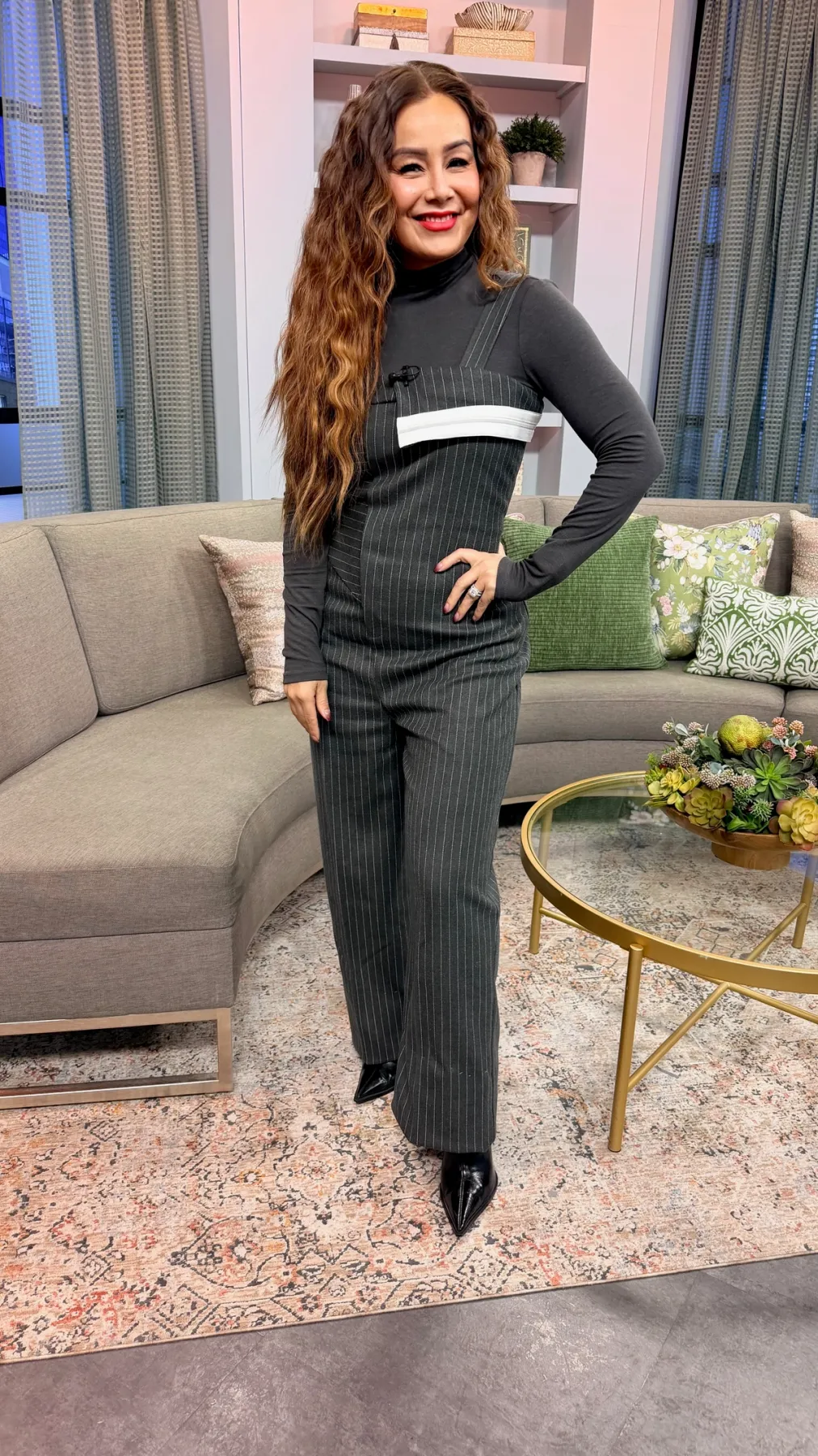 grey pinstripe pattern detachable adjustable straps folded waistband top edge back faux welt pockets logo plaque